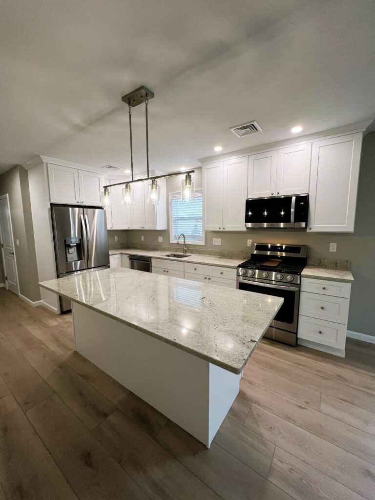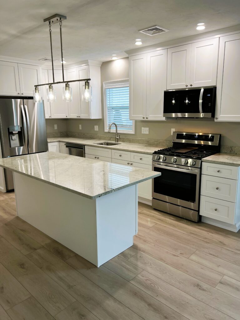 - Modern Kitchen with Stainless Steel Appliances: Refrigerator, Gas Stove, Dishwasher, Microwave, and Garbage Disposal.